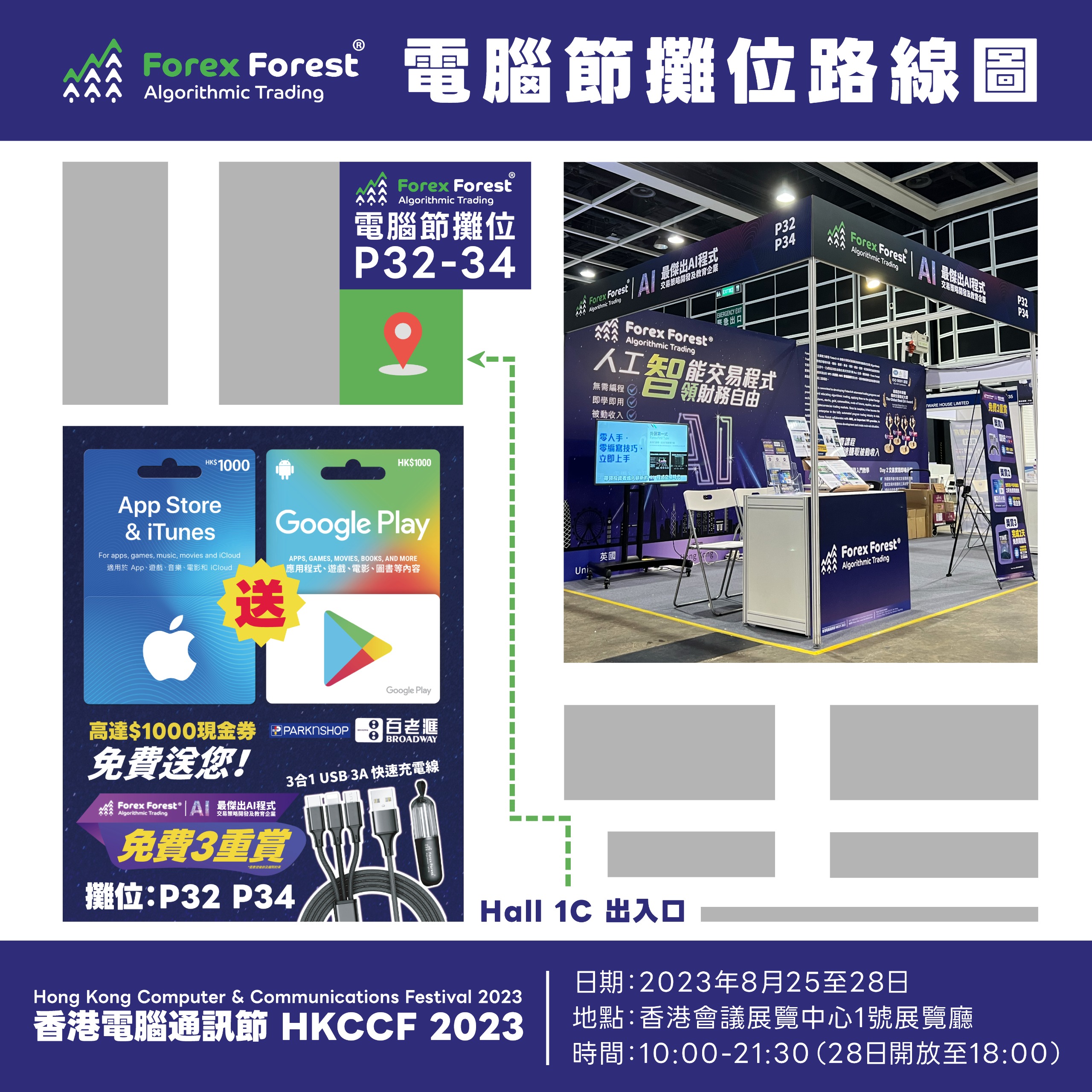 一年一度嘅香港電腦通訊節又嚟啦!今年電腦節將會喺8月25至28日,一連四日喺灣仔會展Hall 1舉行。會場除咗最新電腦資訊同優惠之外,我哋Forex Forest今年亦都首次參展,向大眾推廣AI程式交易,讓大家賺取多一份被動收入。